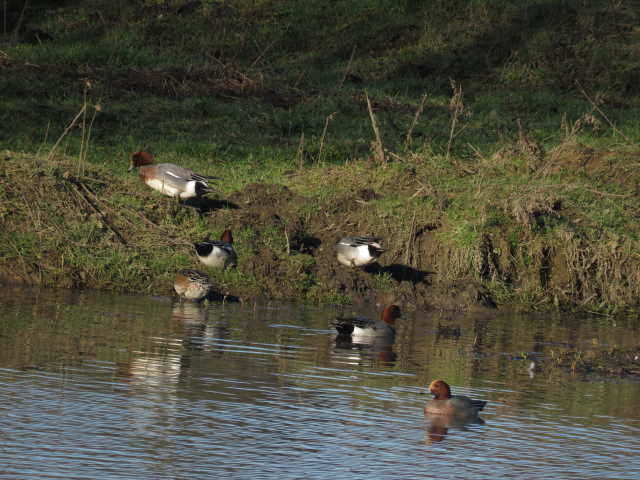 Tommy Flockton’s field, on the line of the canal off Hard Lane, has a good stretch of water. Duck species are attracted here especially over the Winter as migrant species flock in from Northern Europe. Mallard are ever present, maybe 40+, Teal, a small duck species, are also common. The male has the green and brown head markings, the female just brown but both have the glossy green speculum/wingbar, very visible in flight. A Flock of 20+ Wigeon are also regular visitors, forming a tight flock feeding on the grass alongside the water. The white Heron (Little Egret) is becoming a much more common sight as well.