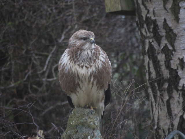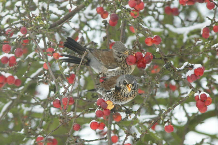 The Winter is a tough time for birds and also for us, so watching garden birds is an attractive option. Especially with snow and frost around, gardens are a source of easy pickings if food is put out. We have found that a mixture of bird seed, sunflower hearts and chopped peanuts together with cheap lard makes a tempting dish. With this we have a regular pair of Great Spotted Woodpecker, flocks of 30+ Chaffinch, about 20 House Sparrow, a maximum count so far of 15 Blackbirds, a good number of Goldfinch and a couple of Yellowhammer. Yellowhammer numbers are disappointing this year as previously a flock of over 30 have visited, it just shows how quickly things can change. We have had a Common Buzzard quite often circling over the adjacent fields which actually perched on the bird table for a while.