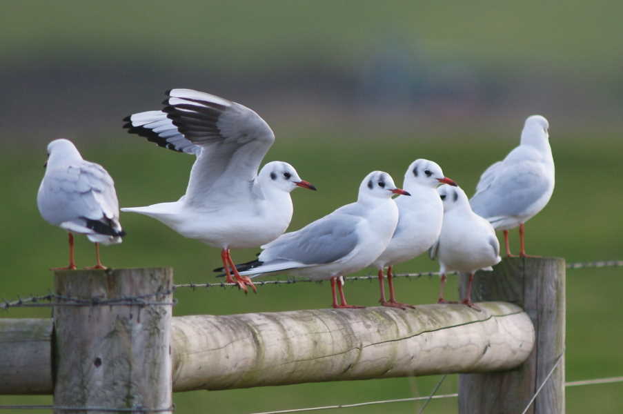 Similar gulls but smaller are the Black-headed, somewhat of a confusing name as they lose the black head after breeding, just a black smudge remaining behind the eye. Identification can be helped by their red legs and inner bill, a very white leading edge to the wing is quite obvious in flight.