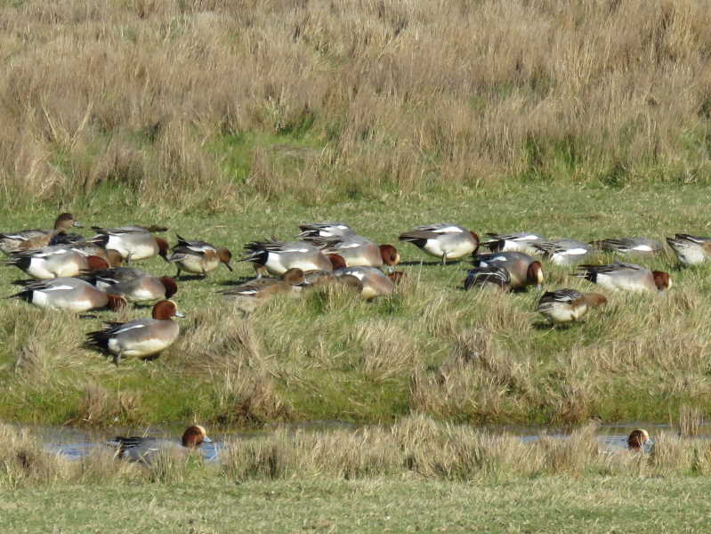Locally, Tommy Flockton’s Marsh has attracted its usual number of wintering Wildfowl. This site is off Hard Lane opposite the entrance to Kiveton Community Woodlands fishing ponds. Here, a flock of Wigeon has been feeding on the grassland for a few weeks, 42 birds has been the highest count. They are one of our most attractive ducks, the male unmistakable with its chestnut head and neck plus a creamy yellow stripe on its forehead and crown. They are usually in a tight flock feeding on the moist areas beside the water.
