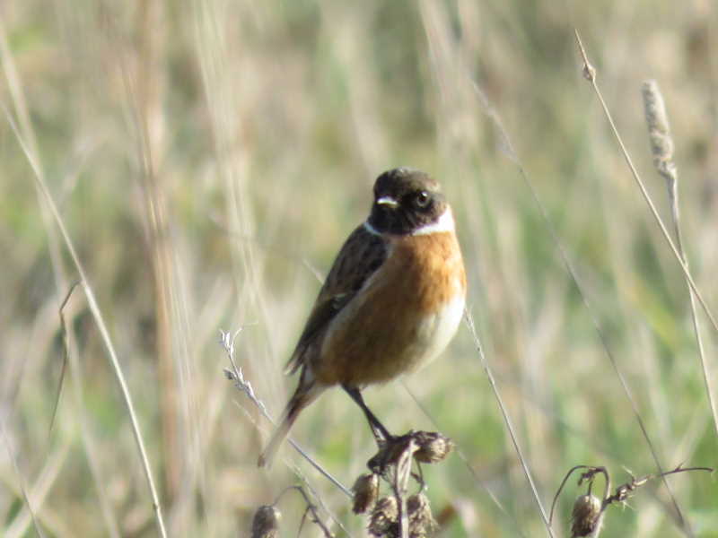 A similar bird also seen perched on the stone walls is the Whinchat, the male also has orange on its breast but has a distinguishing white line over the eye, a white supercilium. This is more migratory than the Stonechat, wintering in Africa, the Stonechat is more of a local migrant, wintering in less harsh areas although some will make it to Southern Europe or Africa. Most years there are more Stonechat recorded than Whinchat, true for our local fields.
