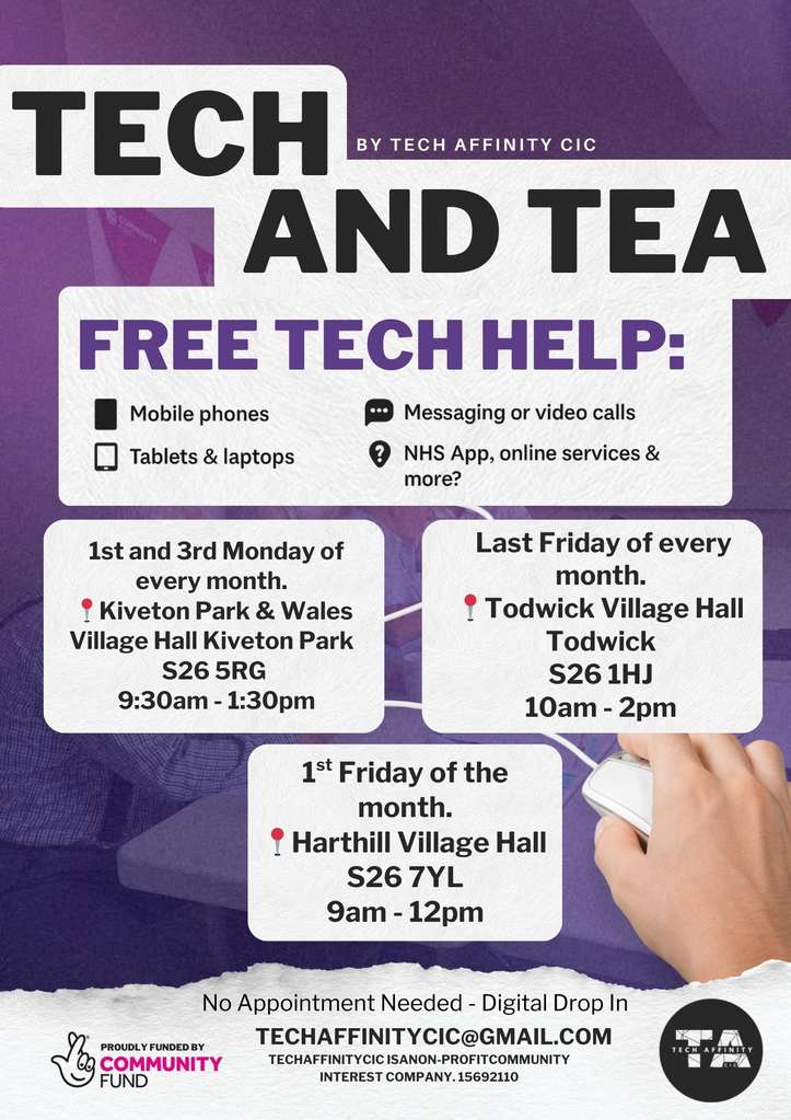 Hi! I’m Richard from Tech Affinity CIC. Every last Friday of the month between 10am and 2pm, I bring Tech & Tea to Todwick Village Hall—a free drop-in session designed to help people get to grips with everyday tech.